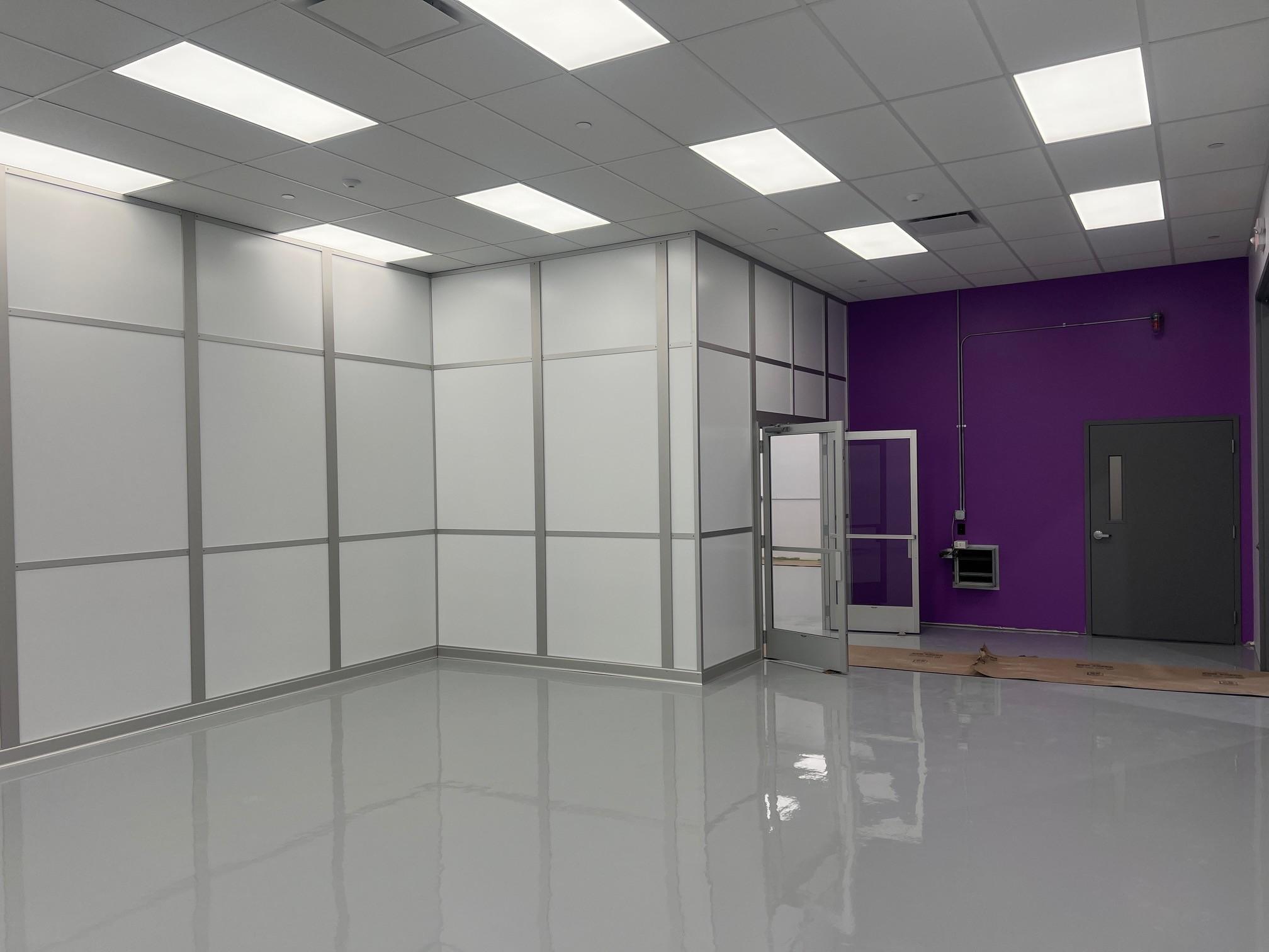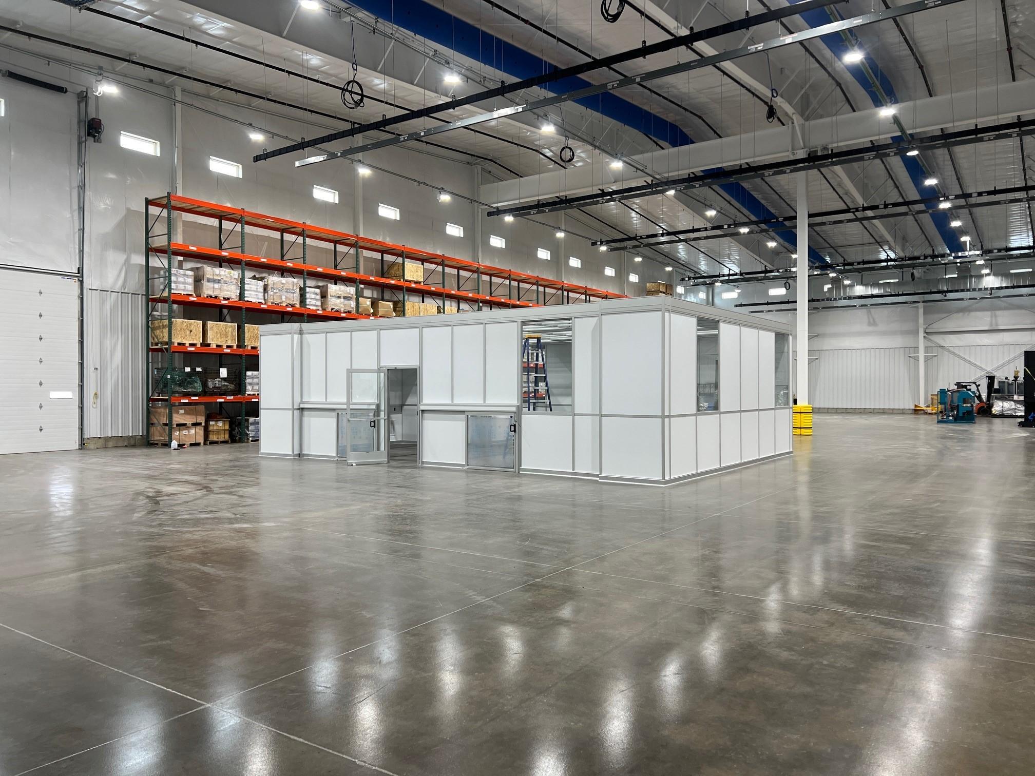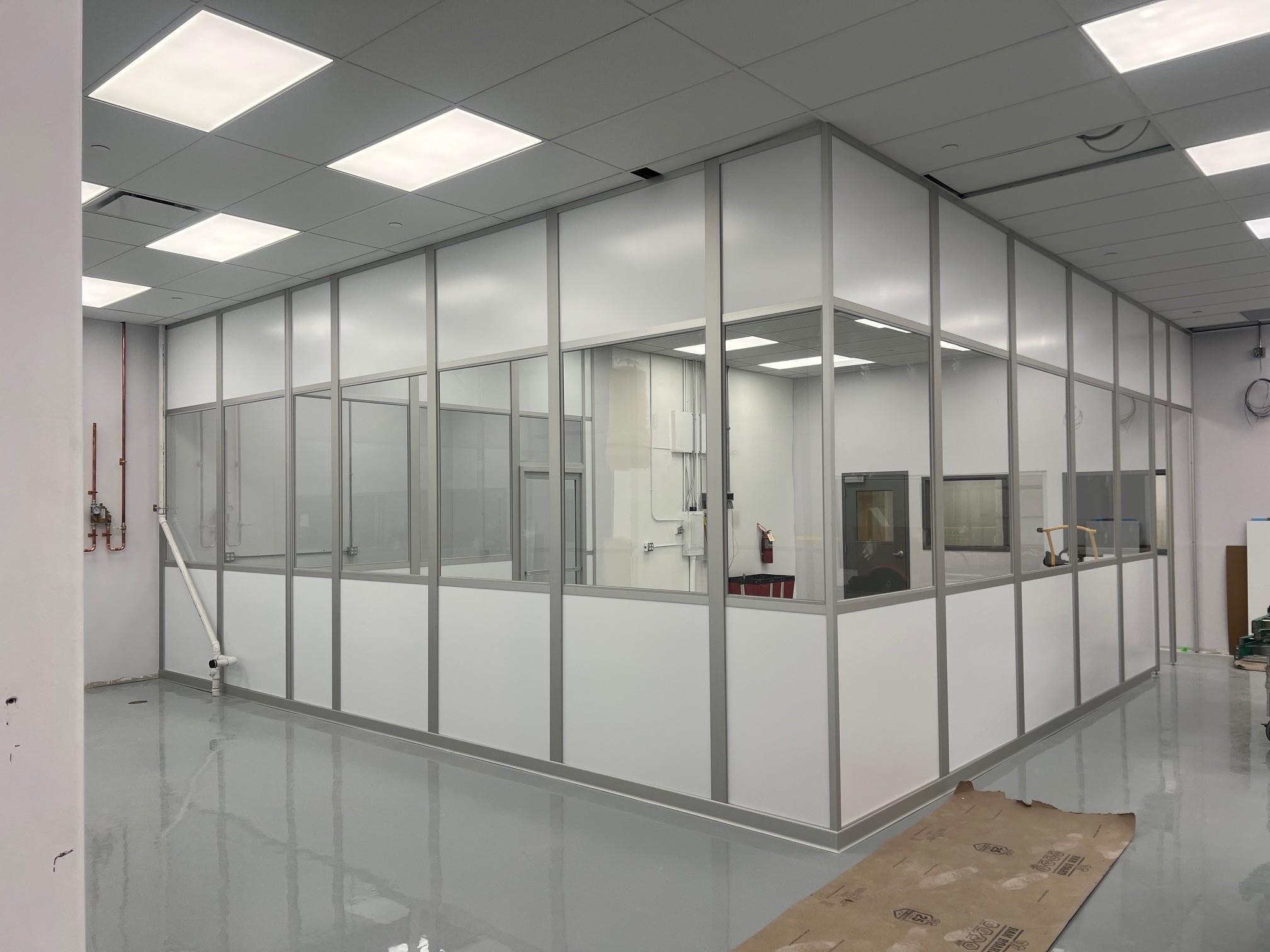 Interior view of a modular cleanroom with glass walls and bright lighting.