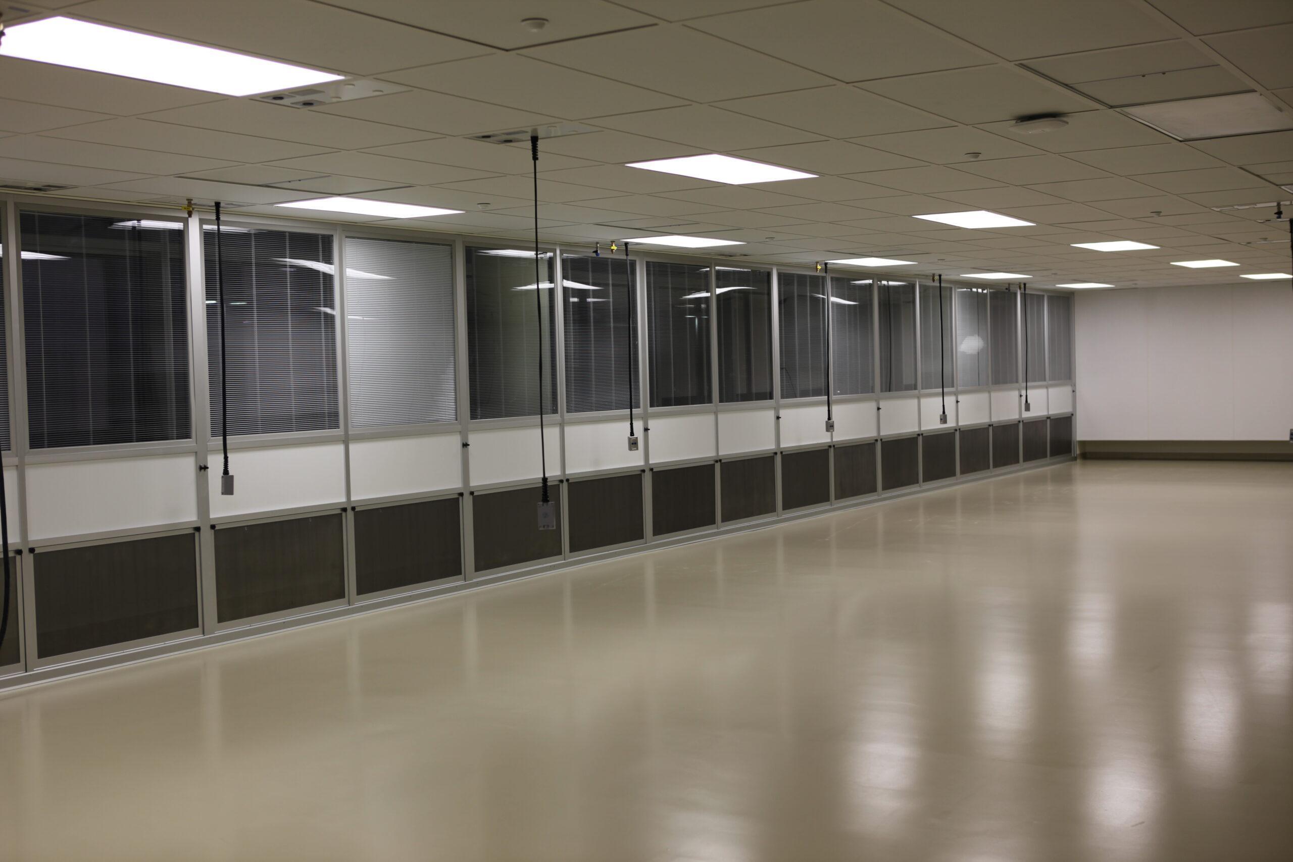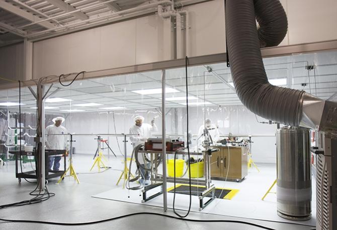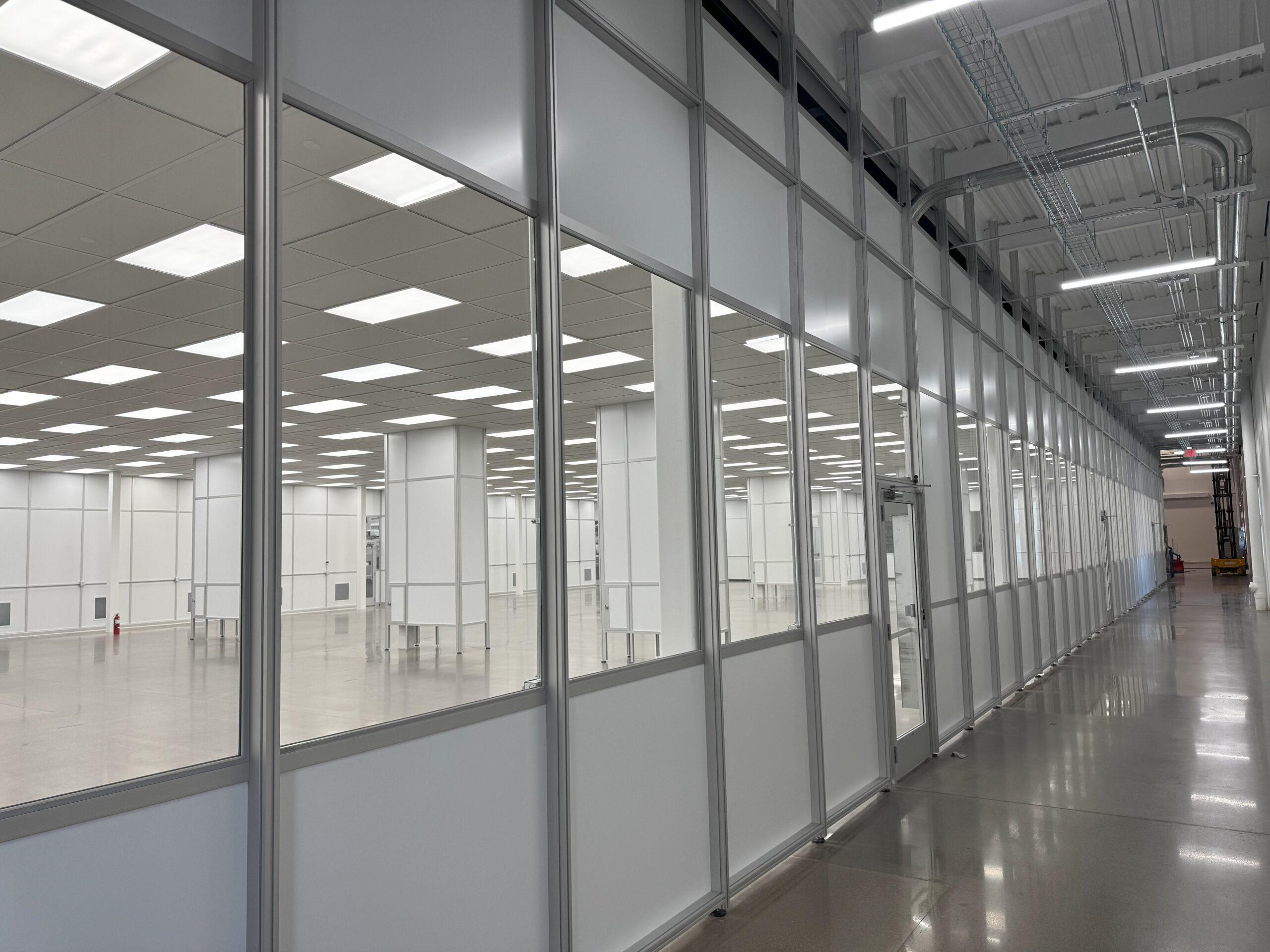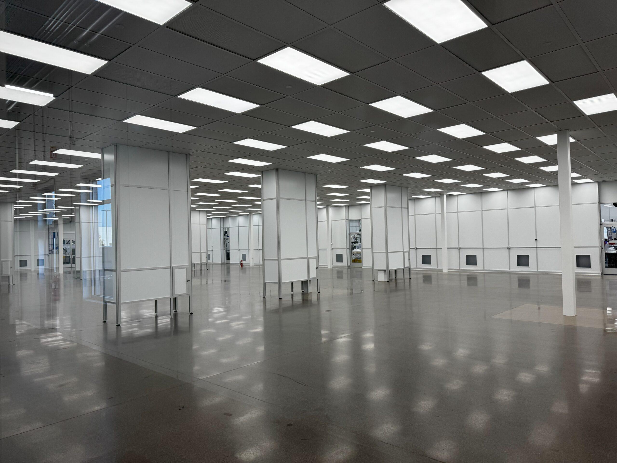 Interior of a large, modular cleanroom with white panelled walls and ceiling lights.